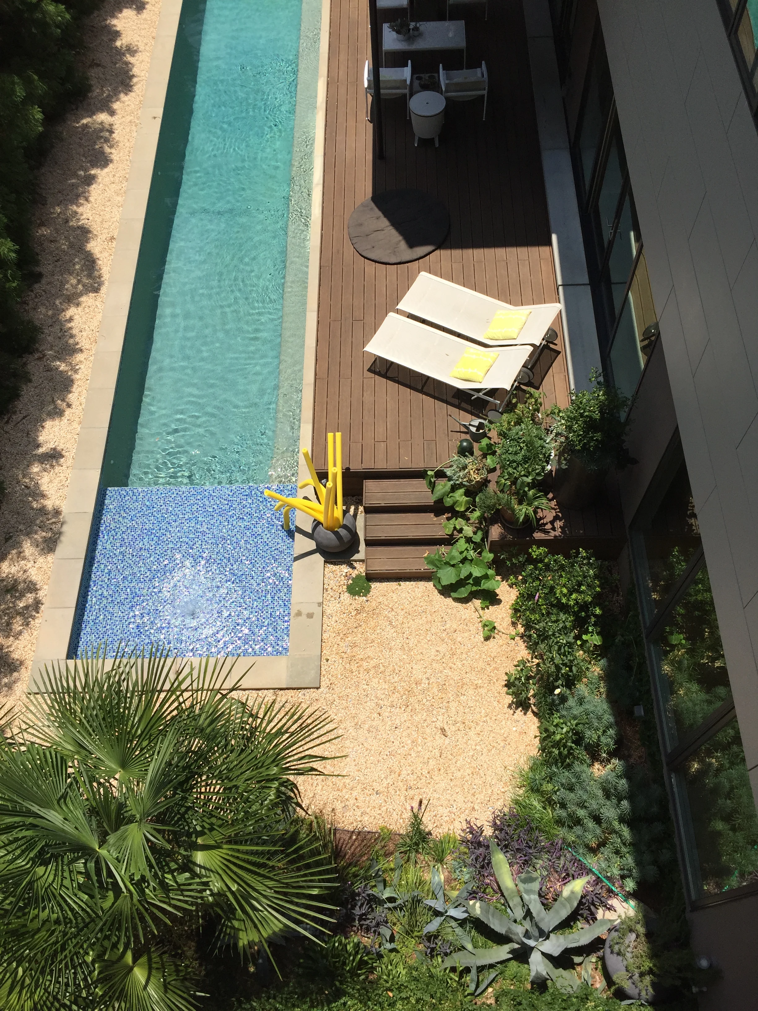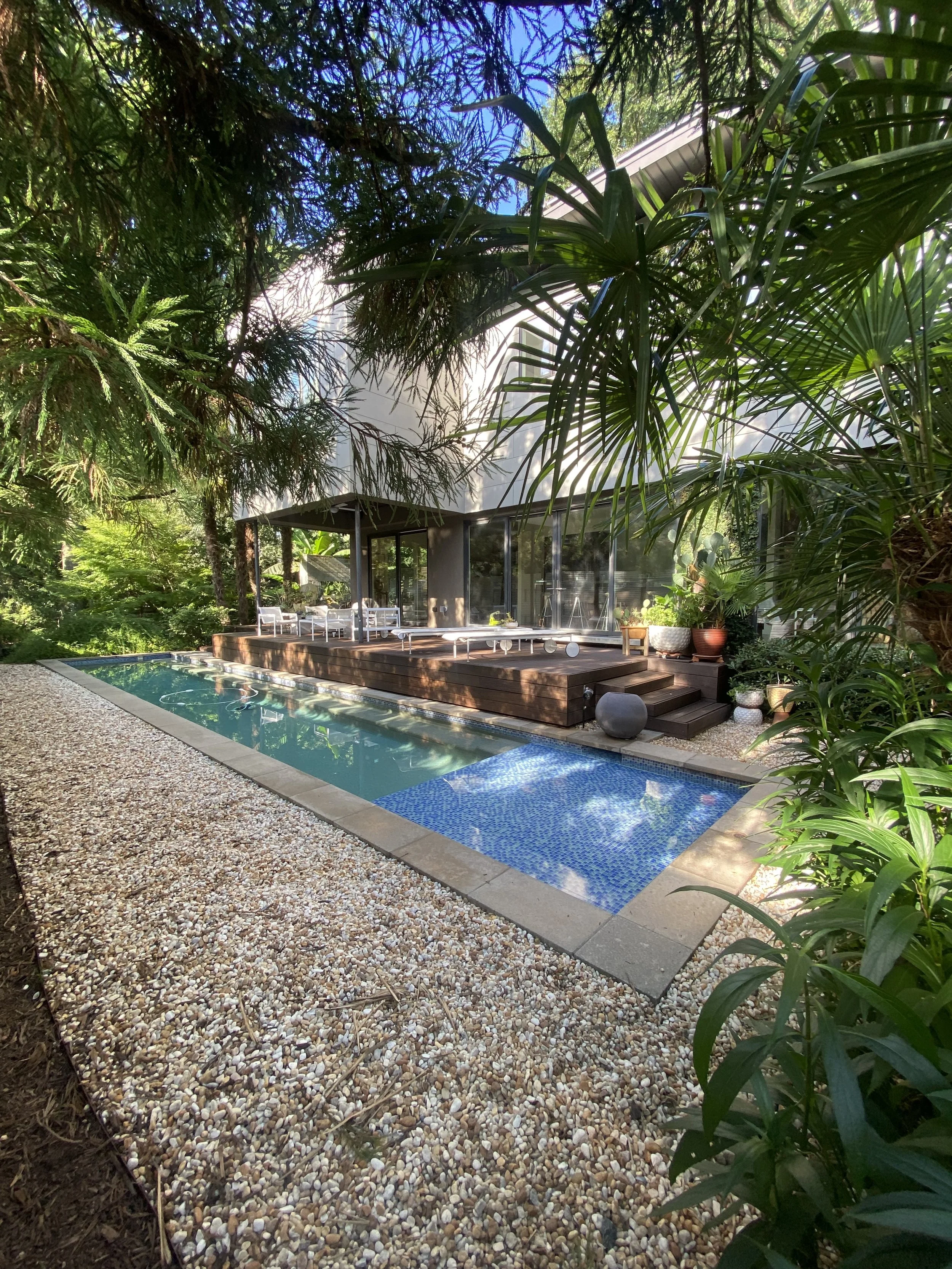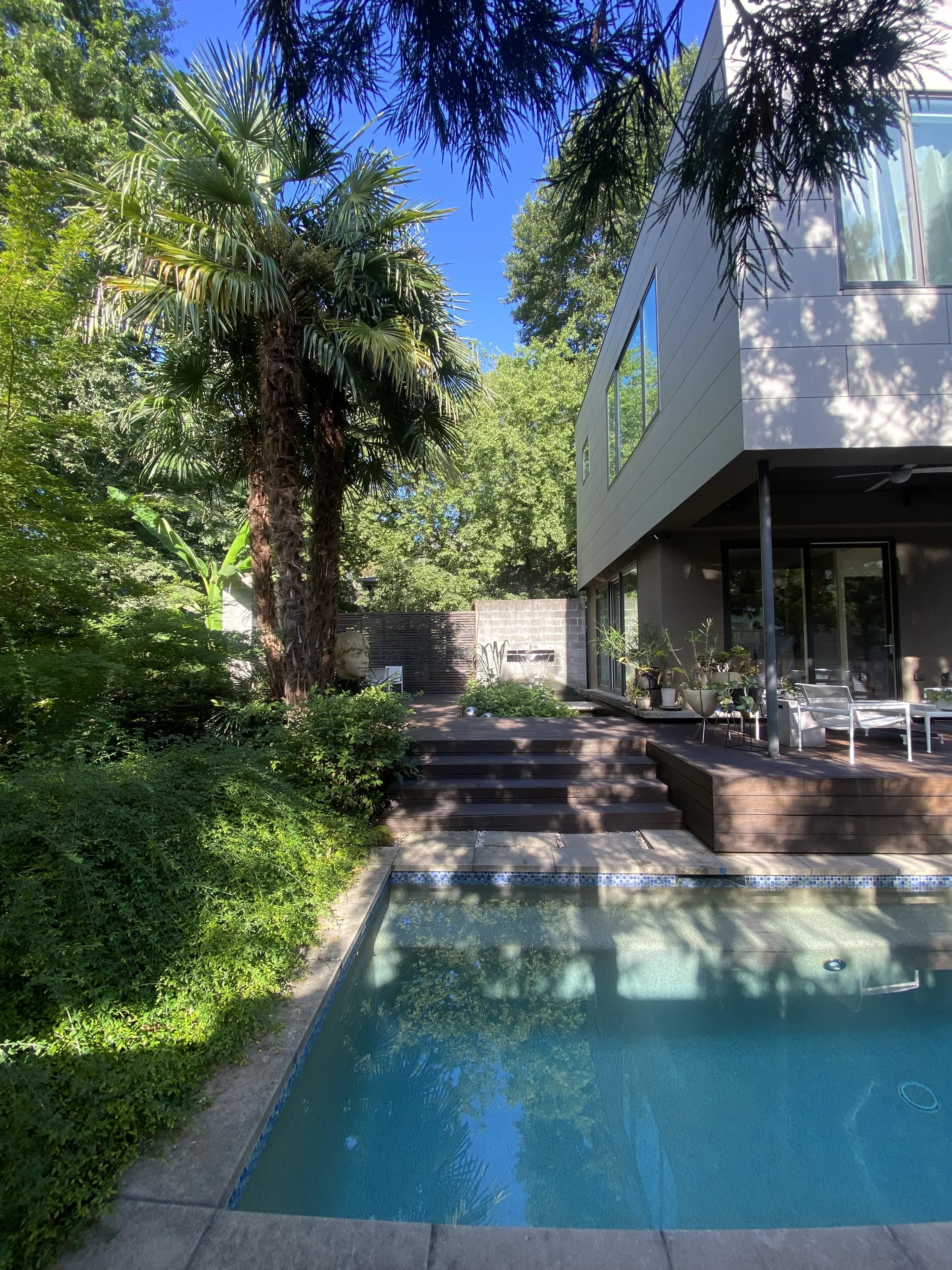 We practice what we preach! After developing ‘Green’ strategies for clients over the years, we wanted to apply many of the techniques, systems and products within the design of our new home and studio. We achieved a LEED Silver rating and are participation with the Build for America program to accurately monitor the systems performance. The house has a geothermal mechanical system that is linked to the water heating system. In hot weather we have the ability to pull cool air from the courtyard, thru the stair well and out the roof. The roof is designed for a future planted system and is prewired for a photovoltaic array. The landscape materials were selected for each particular zone of the property and for their drought tolerance. The entry courtyard allows for a controlled transition from the public street, capturing the sound of the pool fountain at the entry. The living level is focused on the exterior pool/koi courtyard and opens onto the large deck fashioned after the Japanese engawa. The 2nd level studio was designed to benefit from the constant north light allowing us to work with even natural lighting throughout the day.