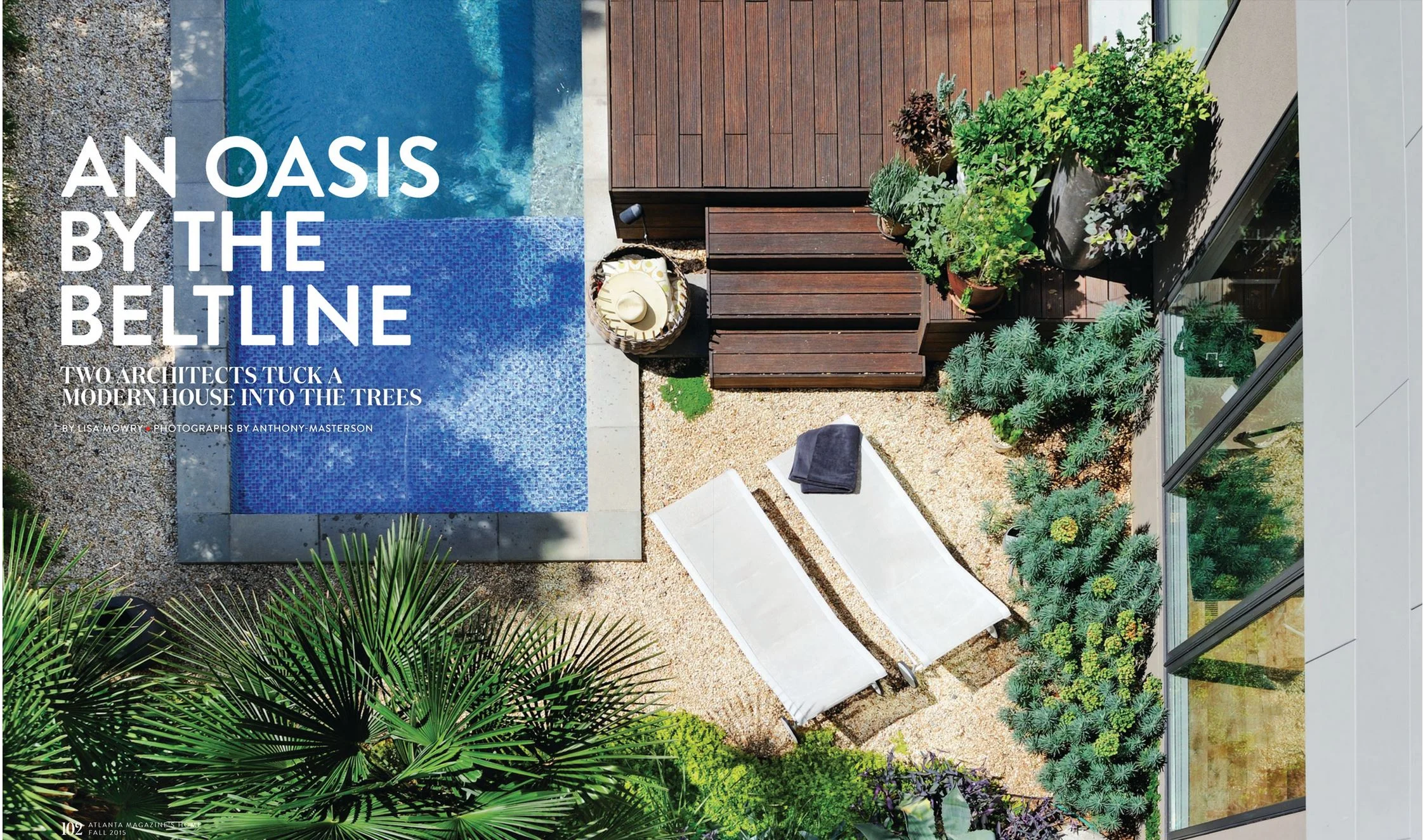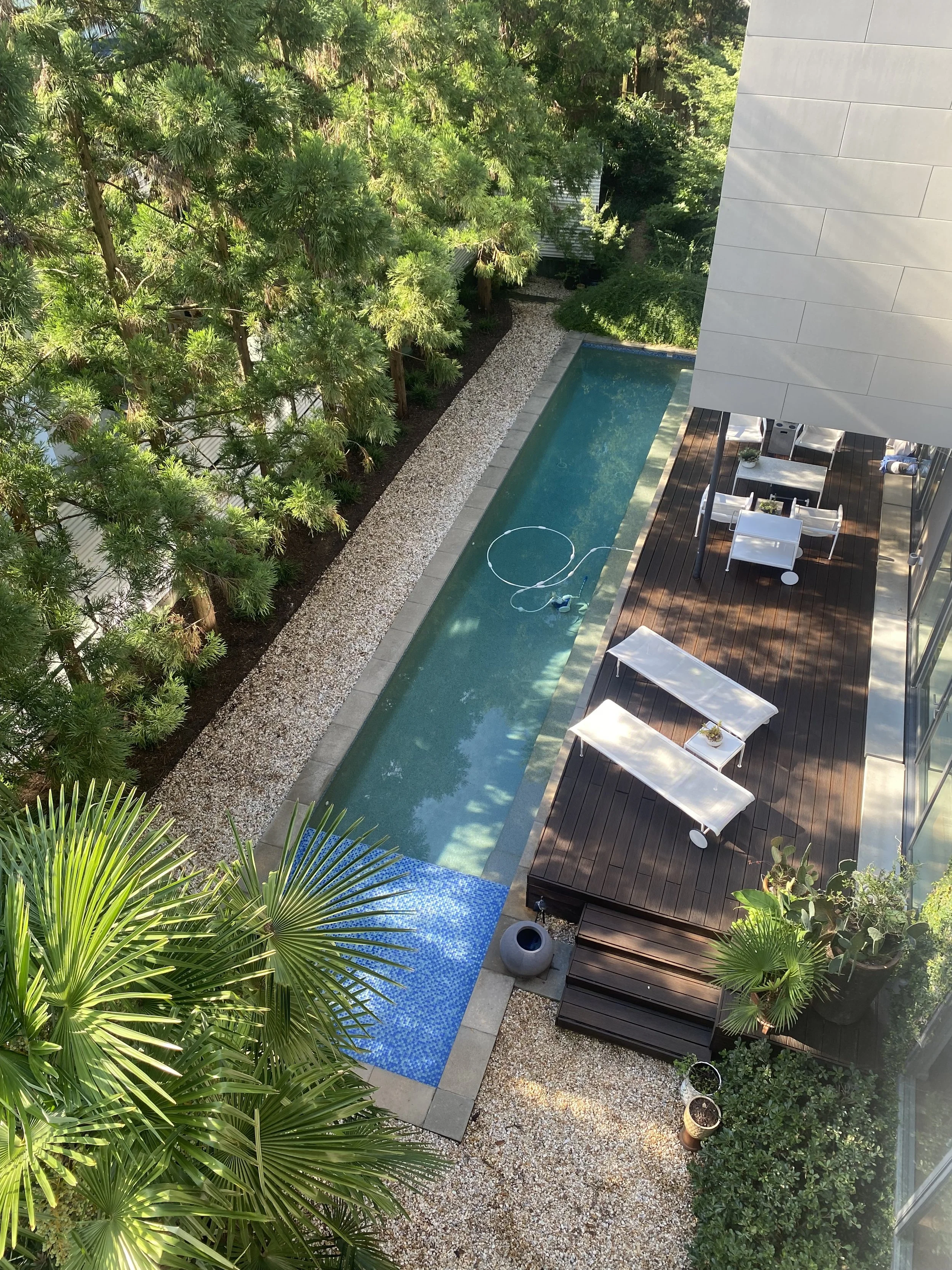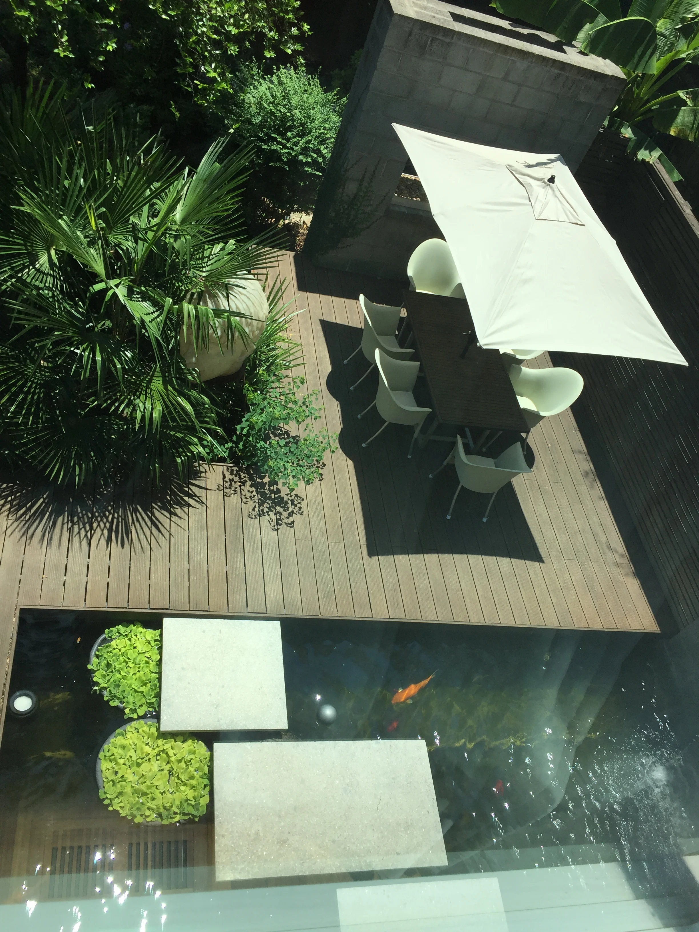 We practice what we preach! After developing ‘Green’ strategies for clients over the years, we wanted to apply many of the techniques, systems and products within the design of our new home and studio. We achieved a LEED Silver rating and are participation with the Build for America program to accurately monitor the systems performance. The house has a geothermal mechanical system that is linked to the water heating system. In hot weather we have the ability to pull cool air from the courtyard, thru the stair well and out the roof. The roof is designed for a future planted system and is prewired for a photovoltaic array. The landscape materials were selected for each particular zone of the property and for their drought tolerance. The entry courtyard allows for a controlled transition from the public street, capturing the sound of the pool fountain at the entry. The living level is focused on the exterior pool/koi courtyard and opens onto the large deck fashioned after the Japanese engawa. The 2nd level studio was designed to benefit from the constant north light allowing us to work with even natural lighting throughout the day.