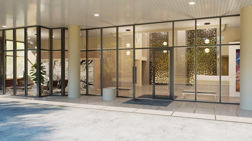 Scheme 2 for the Lobby has a formal warmth. The floor from the motor court to the interior, has a large format travertine patterned tile, with a metal accent between tiles. In this scheme, the front doors are addressed with a new handle and inset floor mats. The Lobby entry is dominated by a pair of illuminated architectural metal screens, with patterns inspired by the Atlanta street grids. The reception desk has a prominent sweeping curve into the lobby space, with an adjacent wood panel that engages the east foyer to display the painting that was previously in the west foyer space. The West foyer has a bank of automated mailboxes for packages, covered in a large format graphic of the silhouetted Ansley trees and adjacent seating area. The residential mailboxes will stay in place, illuminated with new lighting.